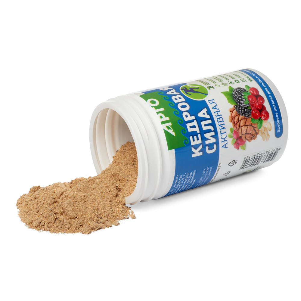 «Кедровая сила – Активная» содержит: ценный растительный белок, включающий заменимые и незаменимые аминокислоты, необходимые для нормального белкового обмена, моно и полиненасыщенные жирные кислоты в оптимальном соотношении с токоферолами, натуральные витамины: Е, D, К, С, РР, группы В, провитамин А (каротиноиды), биофлавоноиды, биологические формы минеральных веществ: калия, магния, фосфора, меди, цинка, марганца, йода, селена, железа, хрома, кальция, серебра, органические кислоты, в том числе янтарную, яблочную, лимонную, винную, салициловую, бензойную и др., пищевые волокна. Способствует повышению подвижности и эластичности суставов, снижению в них воспаления и болей, укрепляет связки и мышечный корсет. Продукт помогает людям в пожилом возрасте сохранить мышечную ткань (природный анаболический эффект) и физическую активность, предотвратить атрофию мышц, повысить минеральную плотность костной ткани. Является прекрасной помощью длительно болеющим людям. Также применяется как натуральное спортивное питание на основе белка кедрового ореха. Полезна для людей, ведущих активный образ жизни. Является источником полноценного растительного белка в концентрированном виде с высоким содержанием «дефицитных» аминокислот – аргинина, лизина, метионина, изолейцина, триптофана. Способствует увеличению мышечной массы и повышению толерантности к физическим нагрузкам.